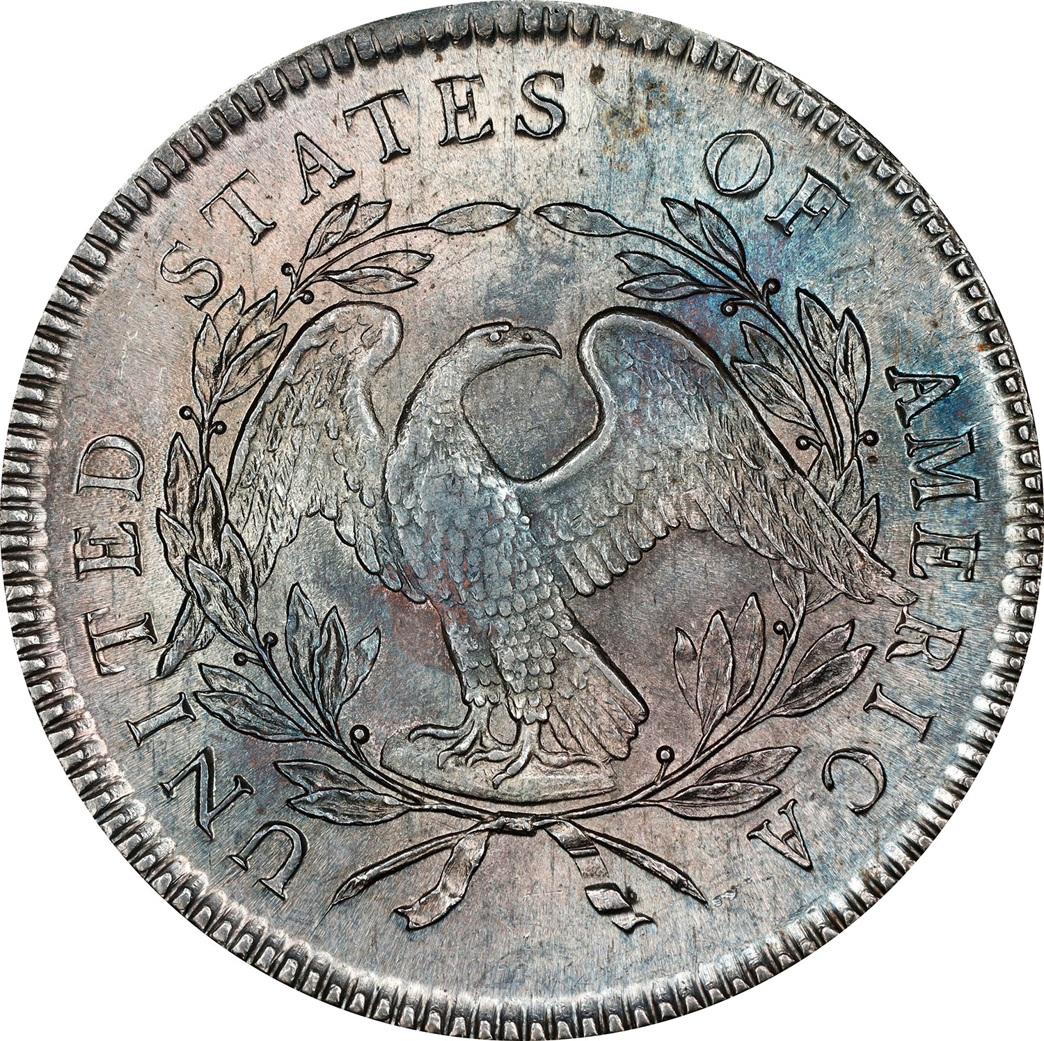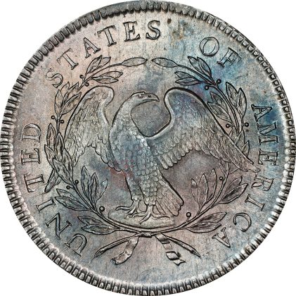 Among a small but very significant contingent of early silver dollars is a gorgeously toned 1795 Flowing Hair, 3 Leaves type of the common BB-5 variety but in uncommonly high grade: PCGS MS-64 CMQ. It was last seen in B. Max Mehl’s 1948 auction of the C.A. Allenburger Collection, where it was called a “Perfect uncirculated specimen.”