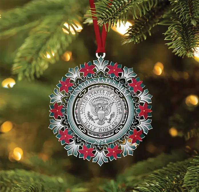According to the Mint’s website, one of this year’s many ornaments features the reverse, or tails, side of the Uncirculated Kennedy half-dollar. It includes the wording “UNITED STATES MINT” and “2024” encircling the coin, which is surrounded by a tiny band of hollies, berries and bright red poinsettias with green foliage forming a wreath around the outer band.